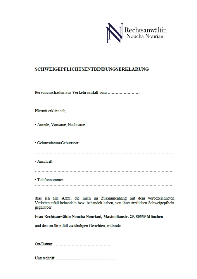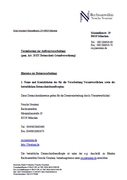 Diese Datenschutz-Information gilt für die Datenverarbeitung durch: Veranwtortlicher: Rechtsanwältin Noucha Nouriani Maximilianstr. 29 80539 München Tel: 089/27373131 Fax: 089/27373133 ra@nouriani.de www.nouriani.de Der betriebliche Datenschutzbeauftragte ist unter der o.g. Anschrift, zu Hd. Noucha Nouriani, beziehungsweise unter ra@nouriani.de erreichbar.