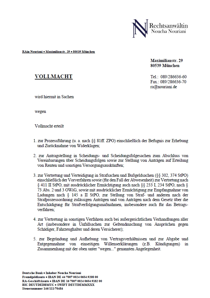 Pflichtangaben nach § 5 TMG Rechtsanwältin Noucha Nouriani Maximilianstr. 29 80539 München Tel: 089/27373131 Fax: 089/27373133 ra@nouriani.de www.nouriani.de Umsatzsteueridentifikationsnummer nach § 27 a UStG: 146/111/70484 Berufshaftpflichtversicherung: Ergo Versicherung AG Nummer HA002089064 Noucha Nouriani ist als Rechtsanwältin in der Bundesrepublik Deutschland zugelassen. Die Zuständige Kammer ist die Rechtsanwaltskammer München, Tal 33, 80331 München. Der Berufsstand der Rechtsanwälte unterliegt im Wesentlichen nachfolgend genannten berufsrechtlichen Regelungen:
